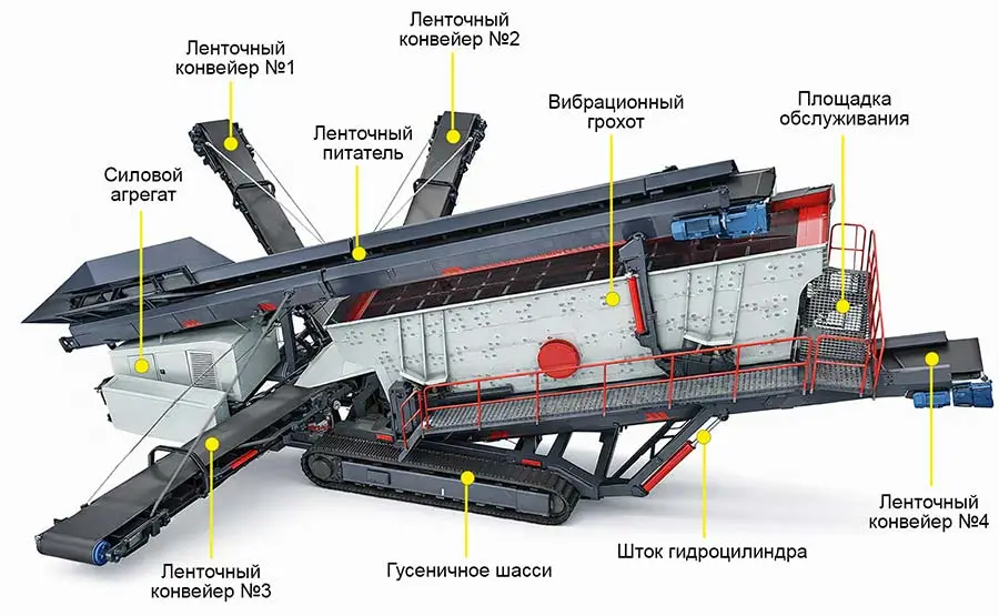 Компоновка выполнена на гусеничном шасси и объединяет узел питания (питатель), вибрационный грохот (2- или 3-дечный), систему ленточных конвейеров выгрузки фракций и подгрохотный конвейер. Благодаря автономному ходу установка быстро перемещается по карьеру/отвалу/демонтажной площадке и позволяет организовать сортировку «там, где лежит материал», снижая затраты на перевозку и перегрузки.