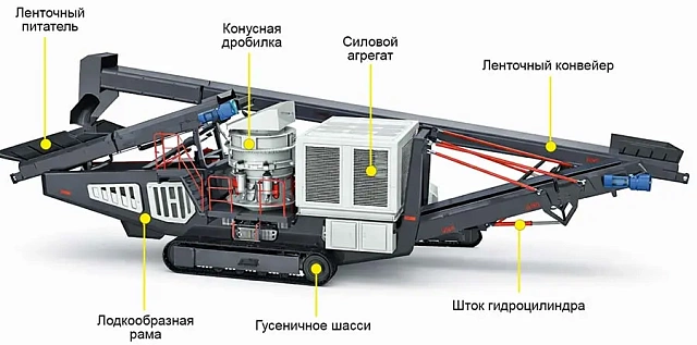 Установка выполнена в виде интегрированного модуля на гусеничном шасси и объединяет узлы приёма/подачи, конусное дробление, транспортирование и (в исполнениях “S”) сортировку с возвратом крупной фракции. Такой формат позволяет развернуть производственный участок без капитального фундамента, быстро переносить комплекс по забою/складу и минимизировать внутриплощадочную логистику.