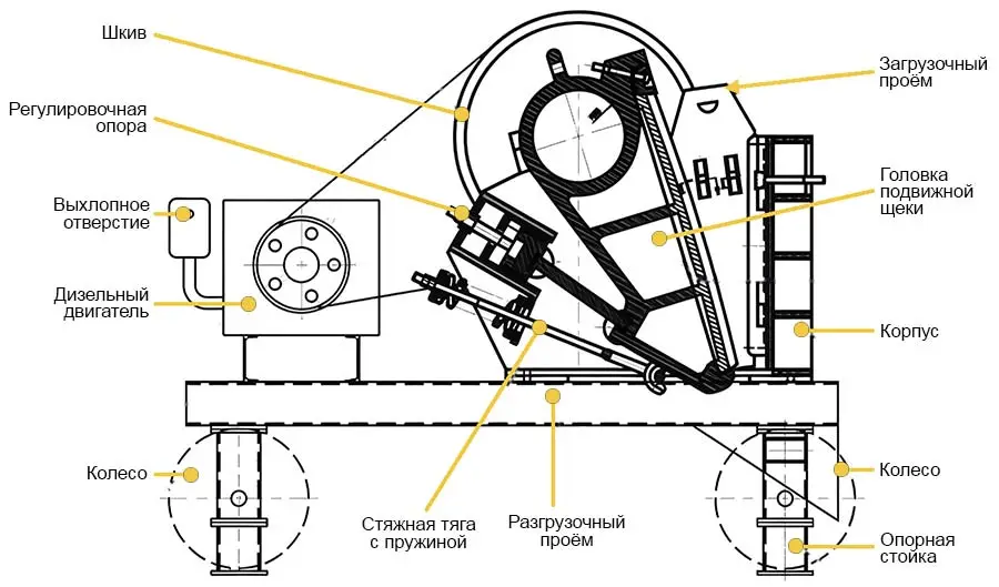 - Материал поступает в верхнюю часть камеры, образованной неподвижной и подвижной щеками. Электродвигатель через ременную передачу вращает маховик и эксцентриковый вал; эксцентрик сообщает качание шатунно-рычажному узлу, и подвижная щека совершает возвратно-поступательное движение. В фазе сближения щёк происходит разрушение материала, в фазе отхода — разгрузка и осыпание вниз.