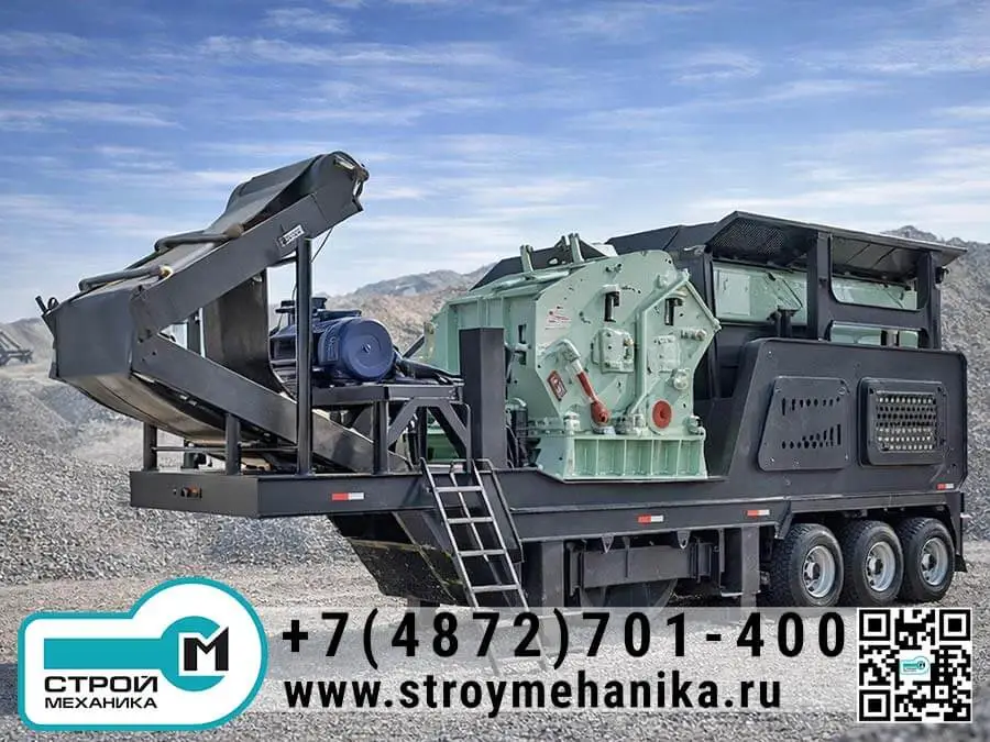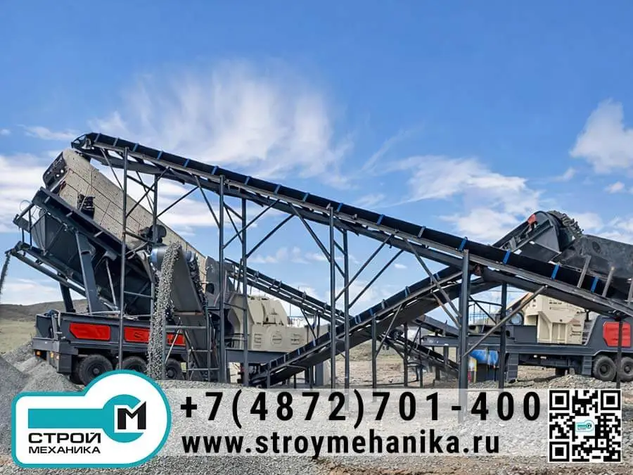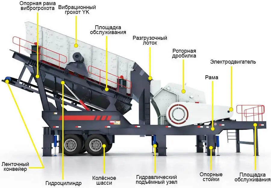 Конструктивно мобильный комплекс реализуется по модульному принципу: на шасси размещаются приёмный узел, питатель, ударная дробилка, конвейерная система и, при необходимости, вибрационный грохот.Благодаря мобильности установка перемещается между фронтами работ и запускается в производственный режим без стационарного фундамента, что критично для карьеров с частой сменой места добычи, дорожно-строительных объектов и площадок рециклинга.