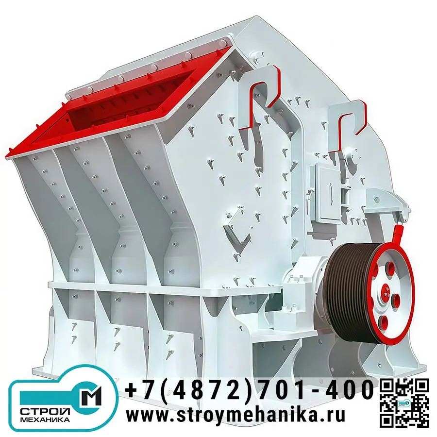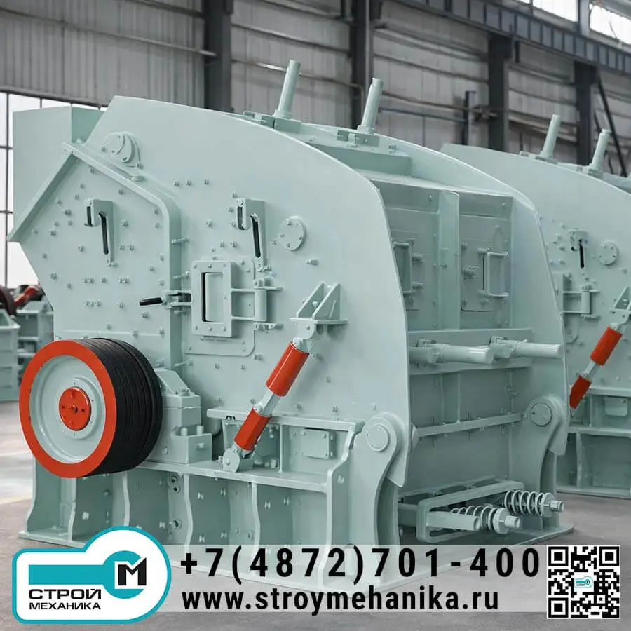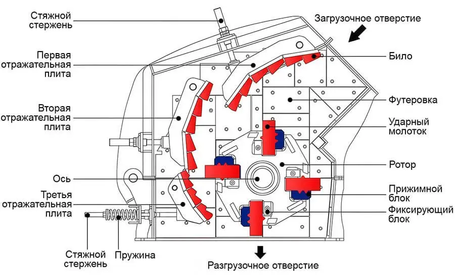 Конструктивно машина включает корпус, роторный узел (вал, ротор, крепления бил), ударные плиты/завесы, а также механизм регулировки зазоров и сервисного доступа. В отраслевой практике именно регулировка зазора между ротором и ударными плитами является ключевым инструментом управления грансоставом: чем меньше зазор и чем дольше материал удерживается в камере, тем мельче итоговый продукт; при увеличении зазора возрастает пропускная способность и укрупняется фракция. Современные решения часто используют гидравлическую регулировку/фиксацию завес для ускорения переналадки и повышения безопасности обслуживания.