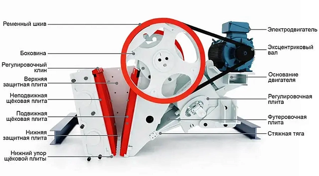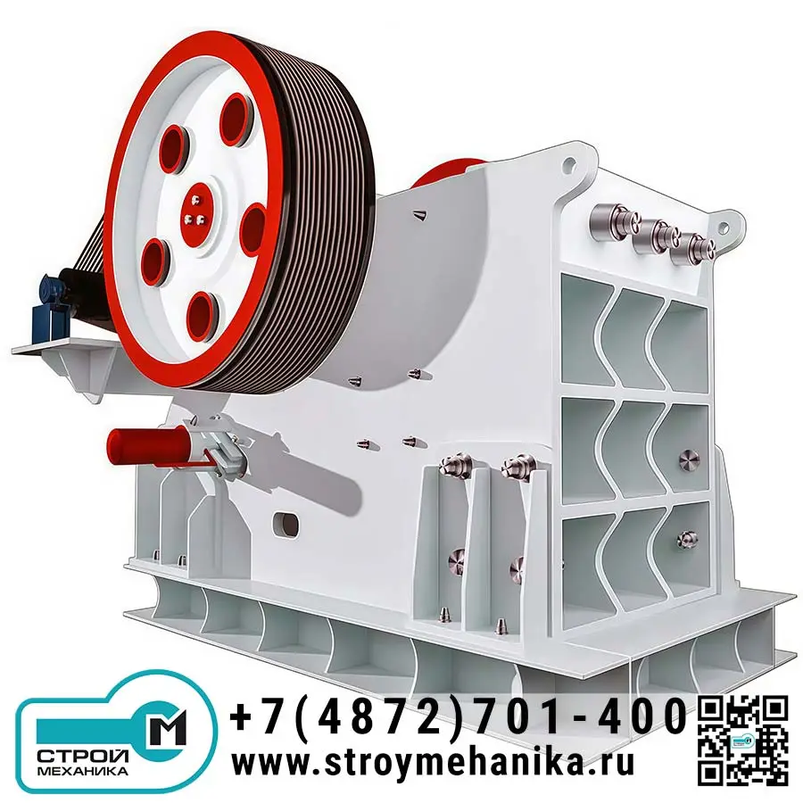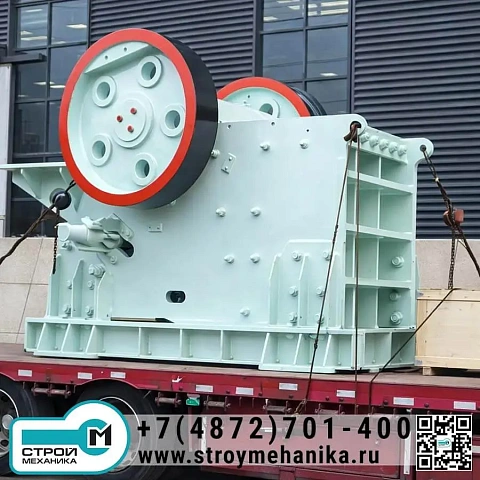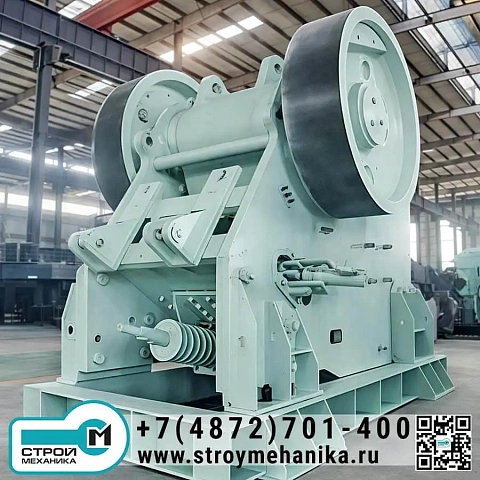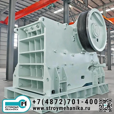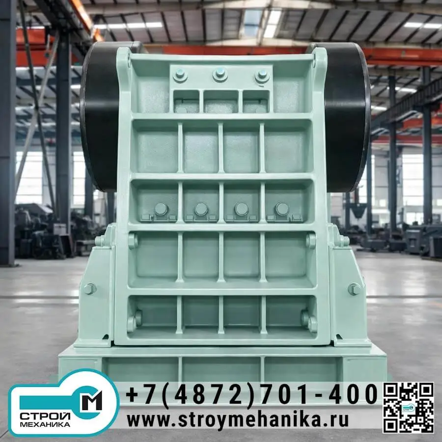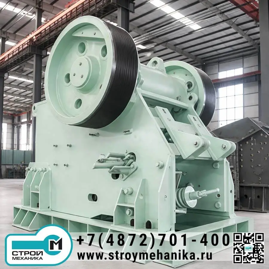 С инженерной точки зрения дробилка реализует «силовую» концепцию первичного разрушения: материал раздавливается в камере между неподвижной и подвижной щеками, а процесс поддерживается кинематикой эксцентрикового вала и оптимизированной геометрией камеры. За счёт сочетания большой камеры, рабочего хода щеки и корректной кинематики достигается высокая производительность в диапазоне 50–1400 т/ч при крупности питания 400–1200 мм.
