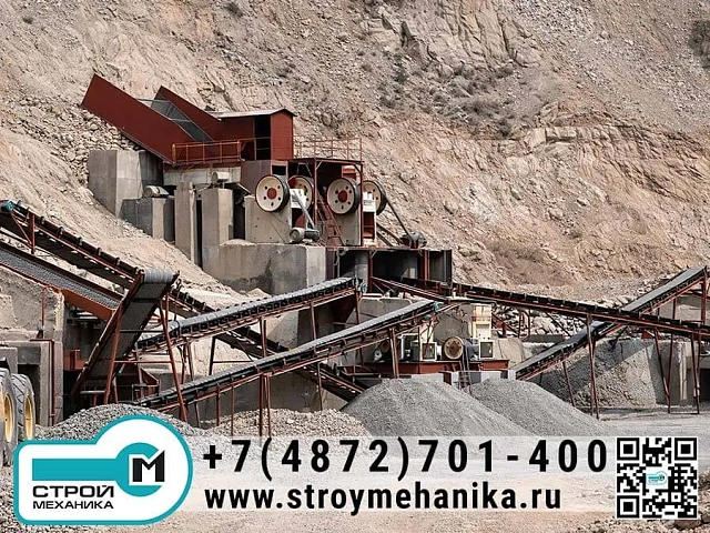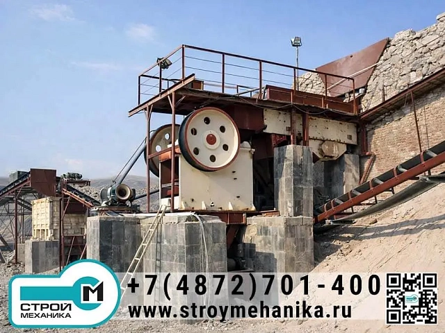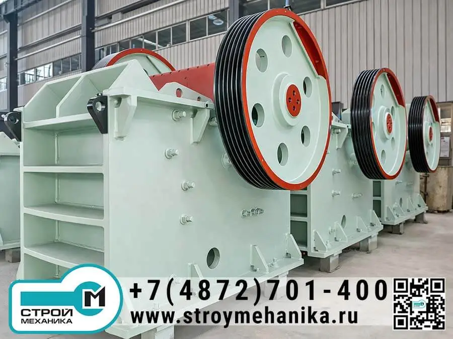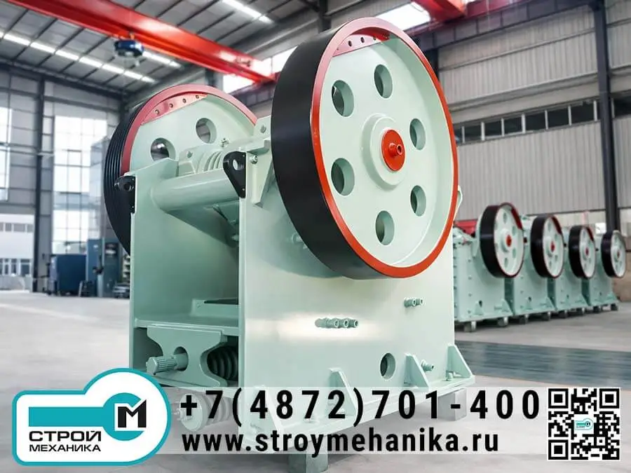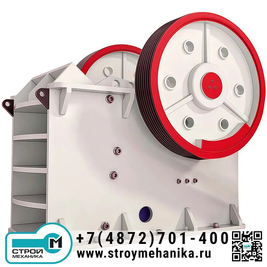 Конструктивно дробилка представляет собой силовую раму (цельную/сборную), узел подвижной и неподвижной щеки со сменными износостойкими плитами, эксцентриковый вал с маховиком, механизм регулировки разгрузочной щели и ремённый привод от электродвигателя. Такая компоновка обеспечивает устойчивую работу под переменной подачей и позволяет настраивать требуемую крупность продукта за счёт изменения выходной щели.