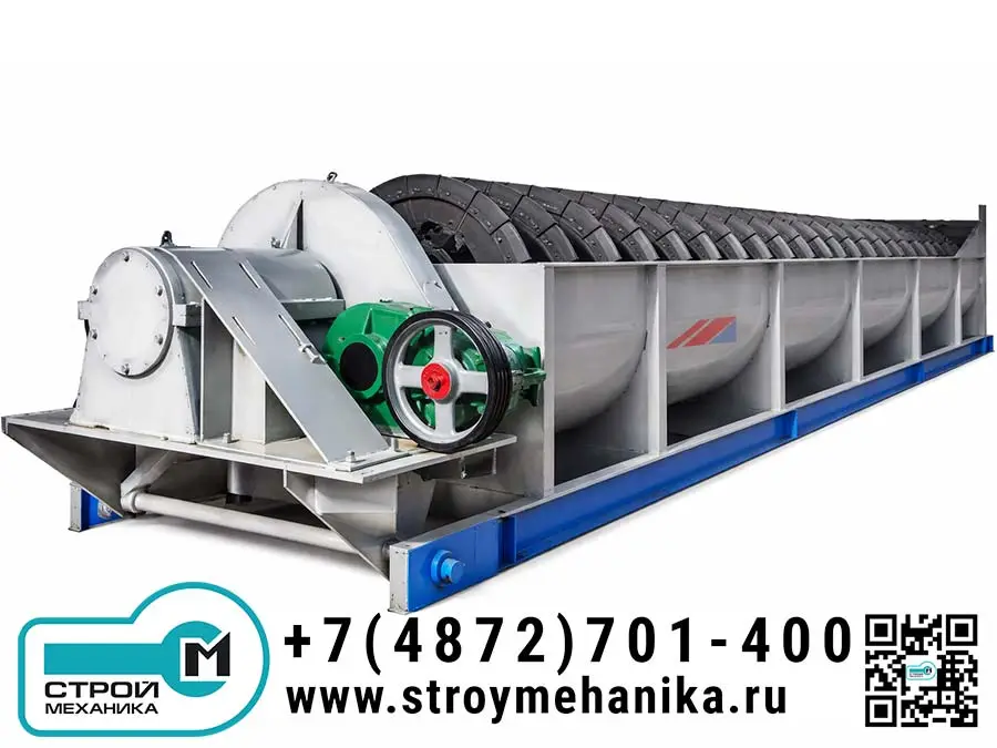 Конструктивно оборудование представляет собой наклонный жёлоб (ванну/корпус) с одним или двумя шнеками (спиралями), приводным узлом и механизмом подъёма/регулировки положения спирали. В рабочем объёме пульпа успокаивается: тонкие частицы удерживаются во взвешенном состоянии и уходят через перелив, а крупные частицы оседают на дно и шнеком перемещаются вверх к разгрузке «песков». Такой принцип позволяет одновременно решать задачи классификации, обезшламливания и частичного обезвоживания песков в зависимости от режима.