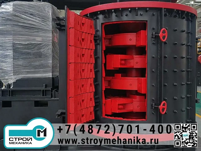 Материал поступает сверху в загрузочную горловину и попадает на разгонный/распределительный узел ротора. Ротор, вращаясь с высокой скоростью, разгоняет и отбрасывает частицы на ударные элементы и износостойкие плиты камеры; далее материал многократно сталкивается со стенками и между собой, проходя чередование ударов, сжатия, среза и истирания. За счёт этого формируется многоактное дробление с постепенным уменьшением крупности, а готовый продукт выводится вниз через разгрузочный участок.