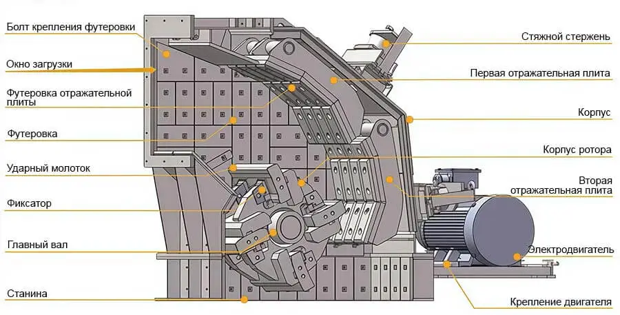 Конструктивно CI-дробилка выполняет дробление в одной машине за счёт работы высокоскоростного ротора-импеллера: материал разгоняется центробежной силой и разрушается при ударах и столкновениях в камере. Это позволяет эффективно совмещать дробление + формование + пескопроизводство, минимизируя долю игловатых/пластинчатых зёрен и улучшая «кубовидность» конечного продукта.