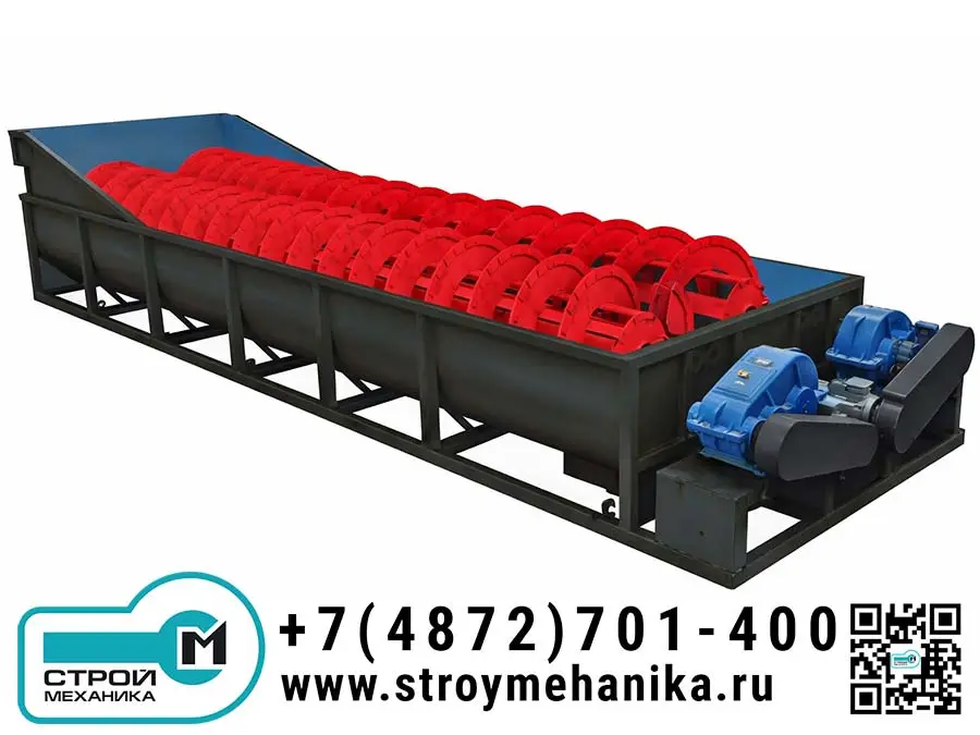 Спиральная пескомойка LX — это оборудование мокрого обогащения, предназначенное для удаления глинистых и пылевидных примесей, а также для классификации по крупности и первичного обезвоживания песка и мелкого щебня. Машина работает в водной ванне: материал в виде пульпы перемешивается спиралью, лёгкие и тонкие фракции уносятся потоком воды, а более тяжёлые песчинки оседают и транспортируются шнеком к разгрузке с одновременным стеканием воды. Такой принцип особенно эффективен для получения стабильного “строительного” песка и песчано-гравийных смесей для дорожных оснований.