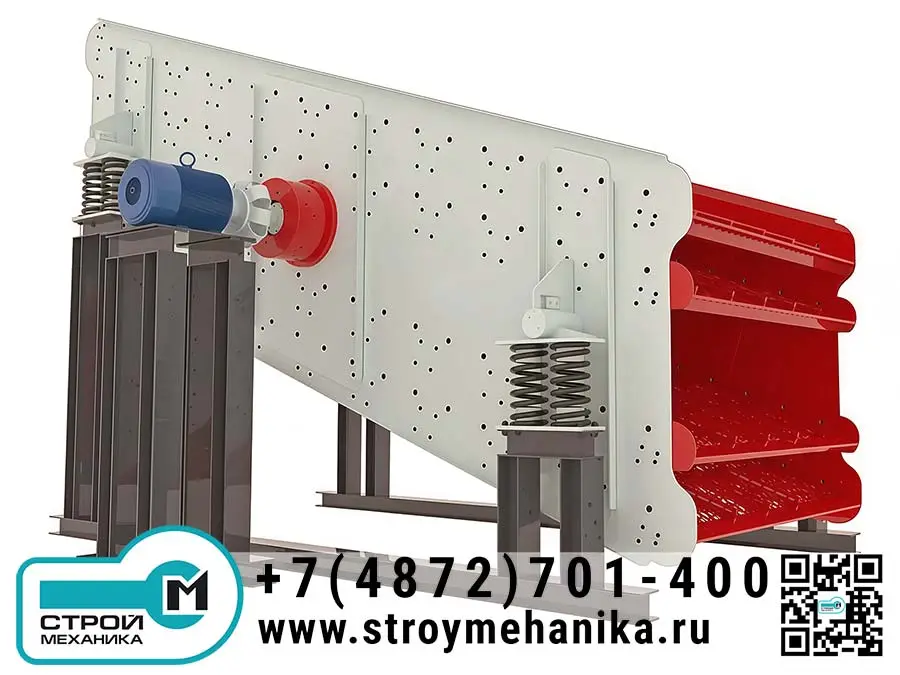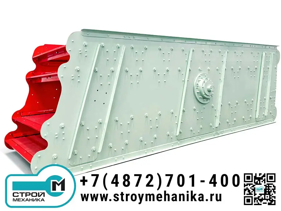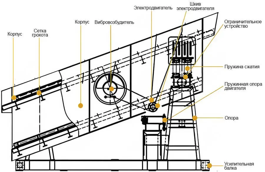 Конструктивно грохот построен на усиленном коробе с поперечными балками и ребрами жесткости, установленном на виброизолирующих пружинах. Возбуждение колебаний формирует вибровозбудитель с валом и эксцентриковыми грузами, который создает требуемую центробежную силу и задает круговую траекторию движения короба. Это повышает «разрыхление» слоя, ускоряет расслоение материала и увеличивает вероятность прохождения мелочи через ячейки, что положительно влияет на точность и эффективность сортировки.