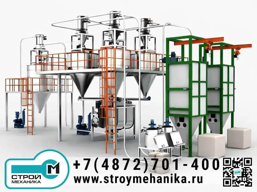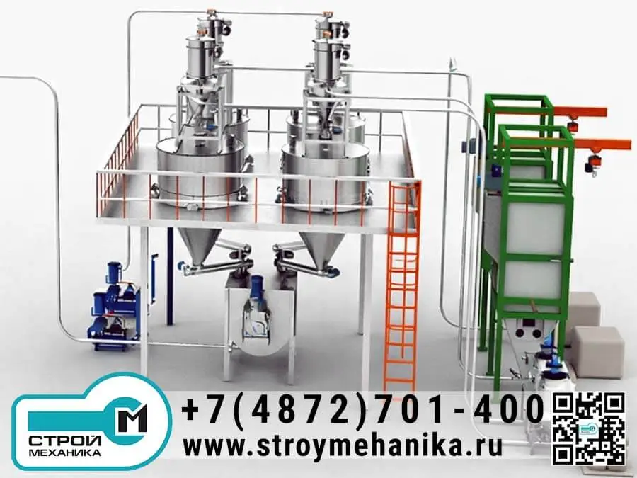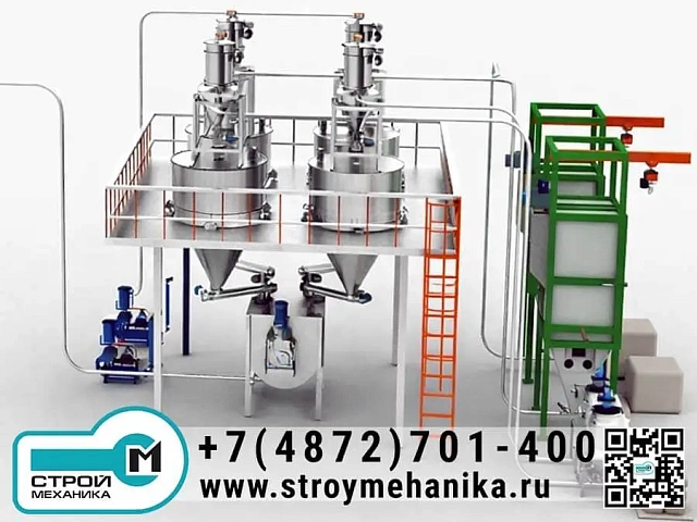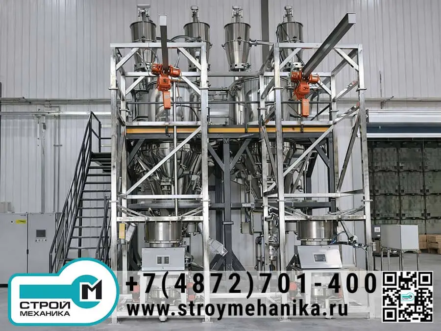 | Тип технологической линии | Станции разгрузки сырья, транспортирование вакуумным конвейером, весовое дозирование, смешивание, фасовка, управление PLC |