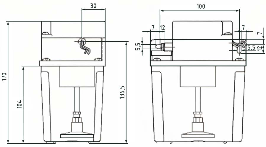 Поплавковый выключатель с нормально разомкнутым контактом. При понижении уровня ниже допустимого выдаёт сигнал «недостаток масла», который можно завести в систему управления станка.