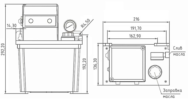 Объём от 0,5 до 4 литров (в зависимости от модели). Выполнен из прочного прозрачного пластика (инженерная смола). Это позволяет видеть уровень масла без разборки.
