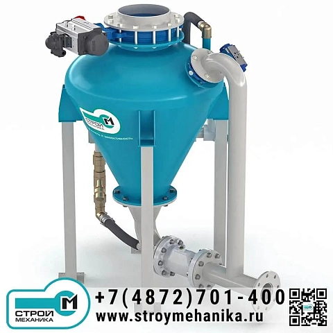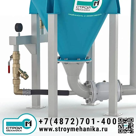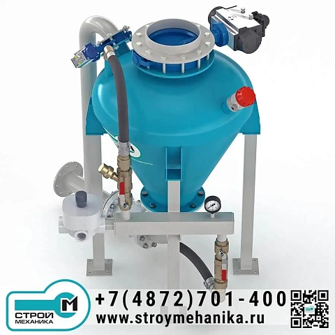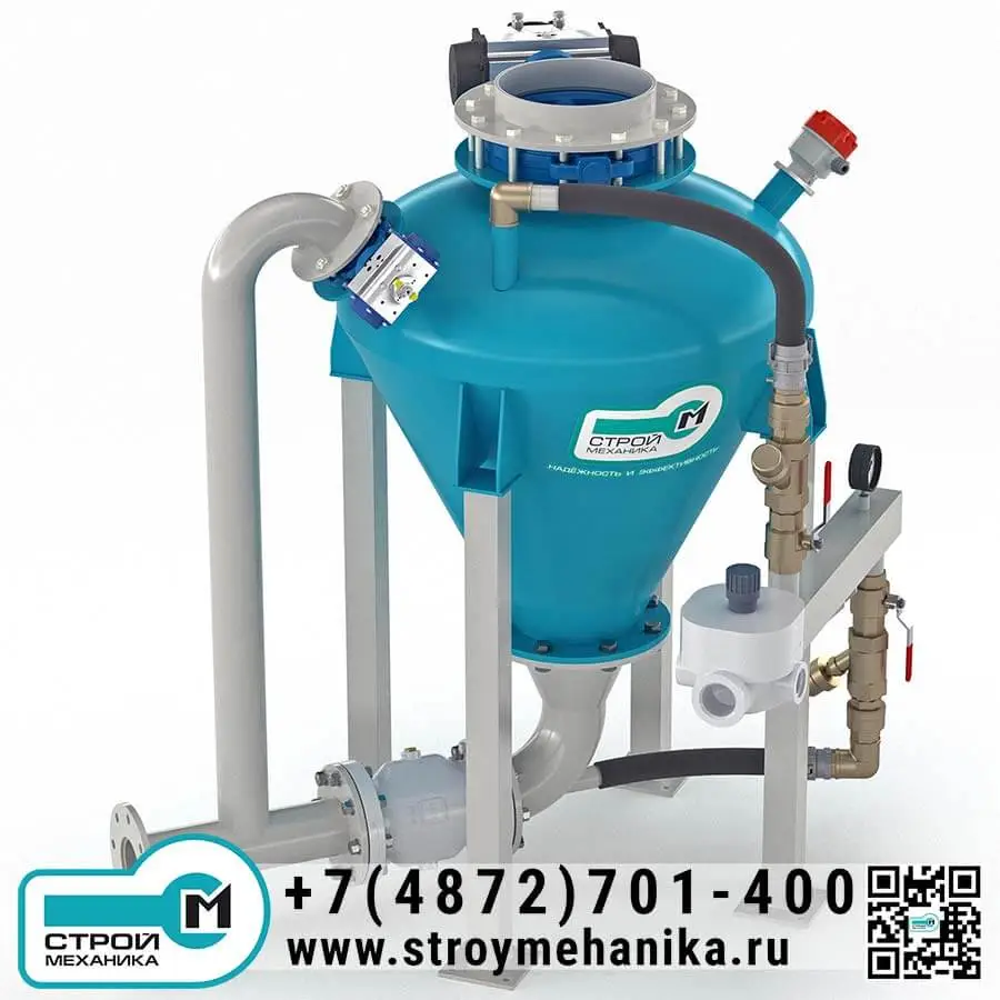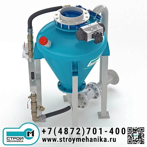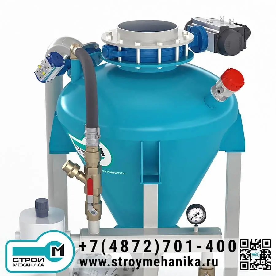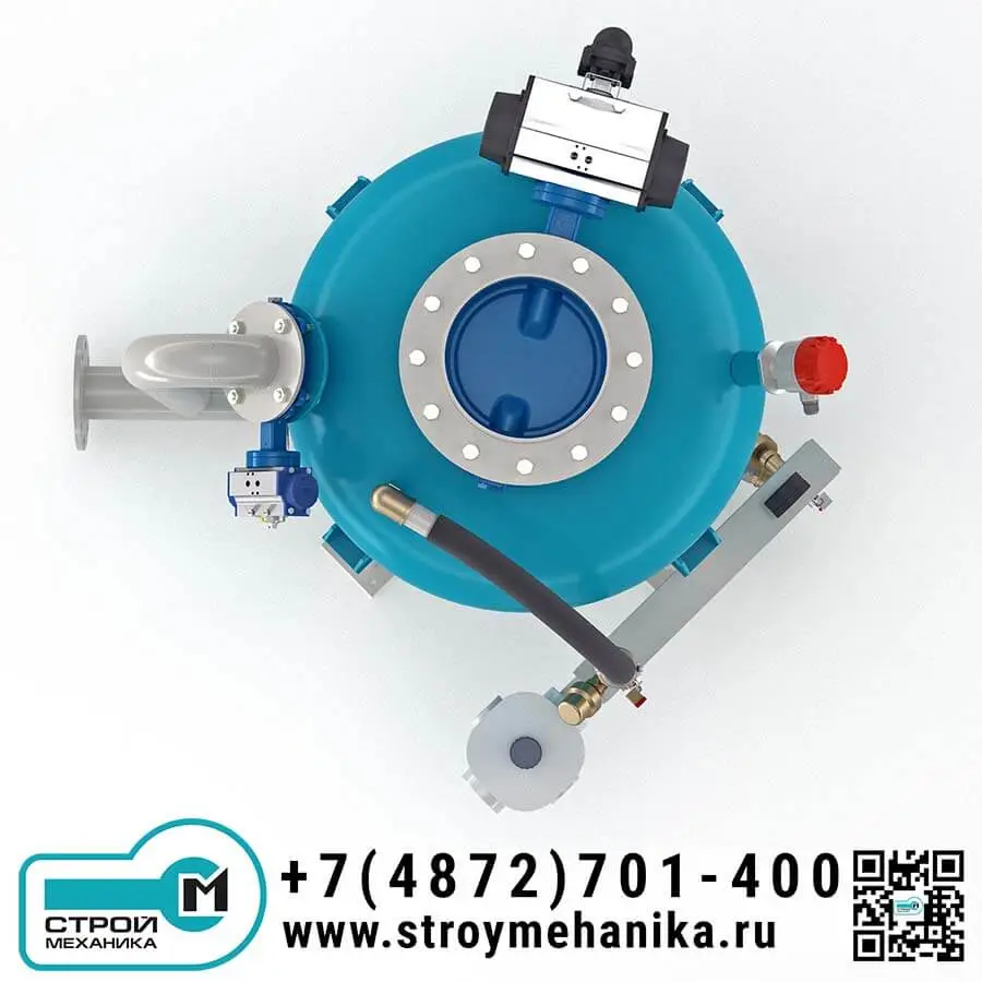 Камера насоса имеет загрузочный люк/патрубок и разгрузочное устройство для ввода материала в трубопровод; разгрузка выполнена через нижний горизонтальный вывод под фланцевое подключение. Такая компоновка практична при работе с трудноаэрируемыми и «тяжёлыми» порошками, поскольку снижает риск зависаний и упрощает формирование плотного потока на входе в магистраль. Управление циклом опирается на контроль заполнения (датчик уровня) и контроль давления в камере.