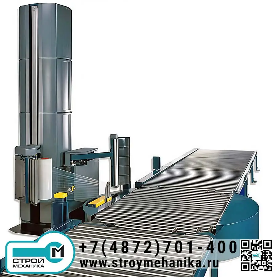 Конструктивно это конвейерная/линейная интеграция с поворотным столом: паллета подаётся в зону обмотки, далее стол выполняет вращение, а каретка плёнки обеспечивает контролируемое нанесение слоёв по высоте груза. Машина ориентирована на быструю интеграцию в фасовочную линию, удобство замены рулона и простоту эксплуатации, а также ведение протоколирования рабочих параметров.