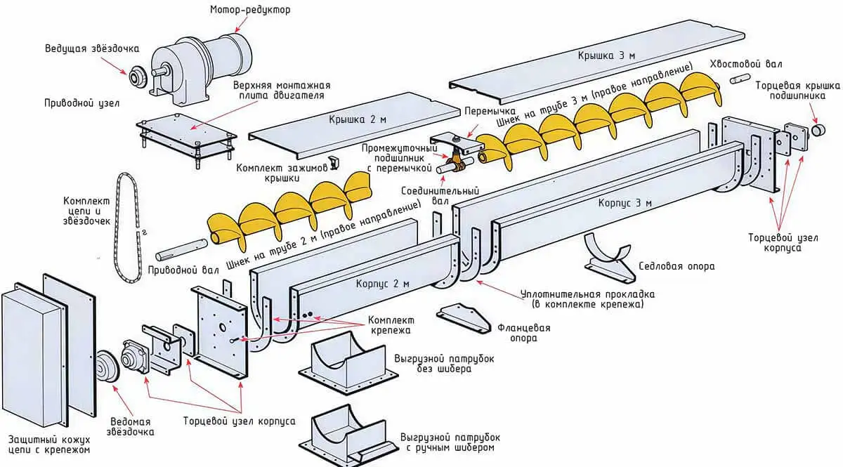 | Модель | Диаметр шнека, мм | Шаг, мм | Частота вращения, об/мин | Производительность, м³/ч | Дальность транспортирования, м |