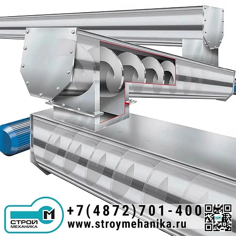Конструктивно оборудование выполнено в виде U-образного транспортирующего корпуса (лотка), внутри которого вращается безвальная шнековая спираль повышенной прочности. Спираль не опирается на промежуточные внутренние подшипники, а «скользит» по нижней части корпуса на износостойкой футеровке, которая одновременно является рабочей опорной поверхностью и защищает корпус от истирания абразивом. Такое решение особенно эффективно там, где внутренние подвесные подшипники традиционных шнеков быстро выходят из строя и становятся «точками» накопления материала.