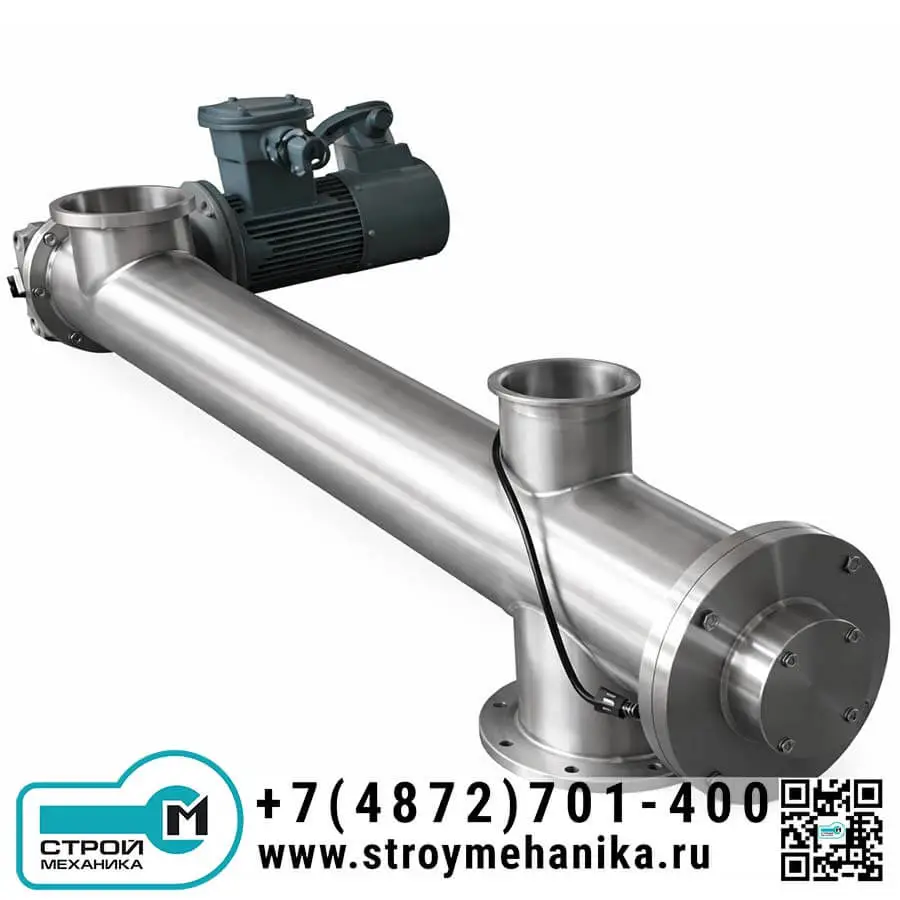 Корпус выполнен в виде наружной трубы, собранной по общей длине. В конструкции предусматривается минимум один входной и один выходной патрубок, при необходимости - дополнительные патрубки по технологическому заданию. На концах секций трубы выполнены сварные фланцы, обеспечивающие жёсткое и герметичное соединение. Внутри трубы находится шнековый орган: винтовая лента (спираль) точно приварена к центральной трубе, а секции шнека соединяются муфтами. Такая модульная сборка удобна для изготовления и монтажа на требуемую длину, а также упрощает ремонт.